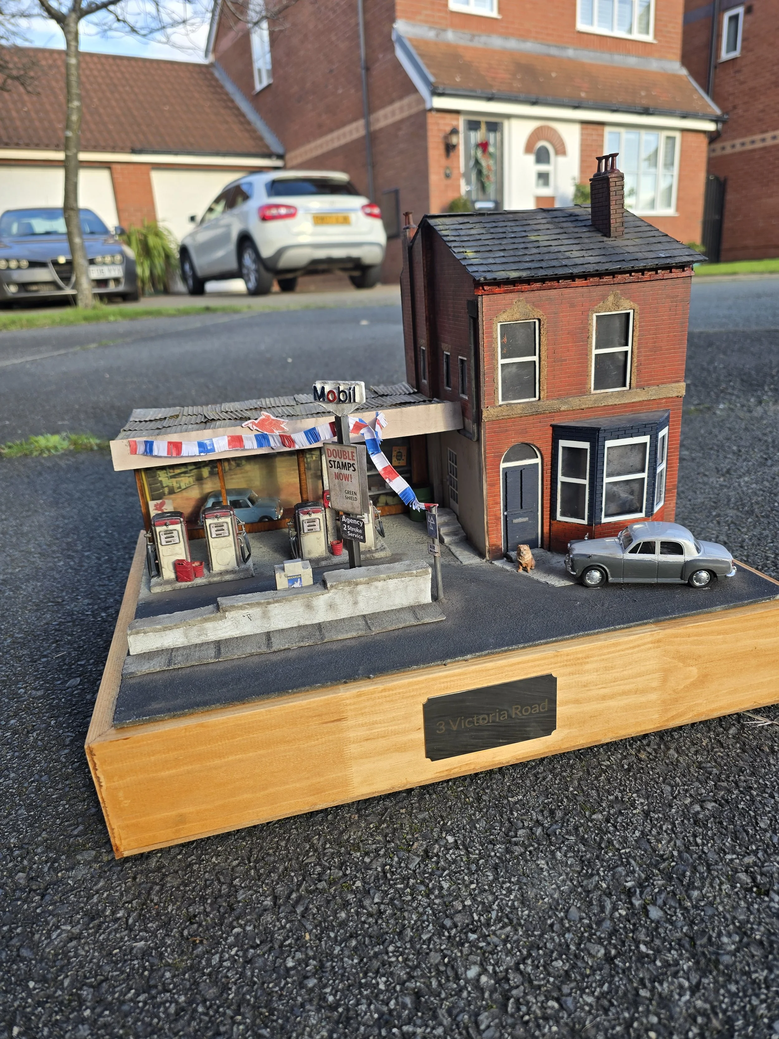 This miniature recreates a family-run garage and home as it once was, right down to the signage, the pumps, the car on the drive, and even the dog waiting by the door.